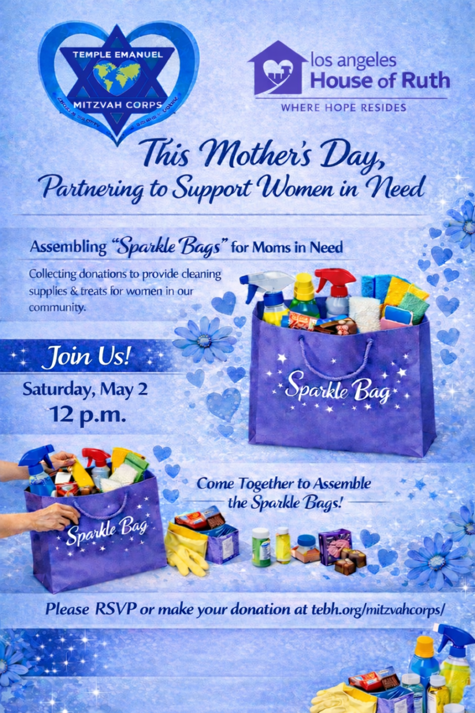 We also invite you to join us on Saturday, May 2, when we will come together as a community to assemble the Sparkle Bags. It’s a meaningful and hands-on way to make a difference.